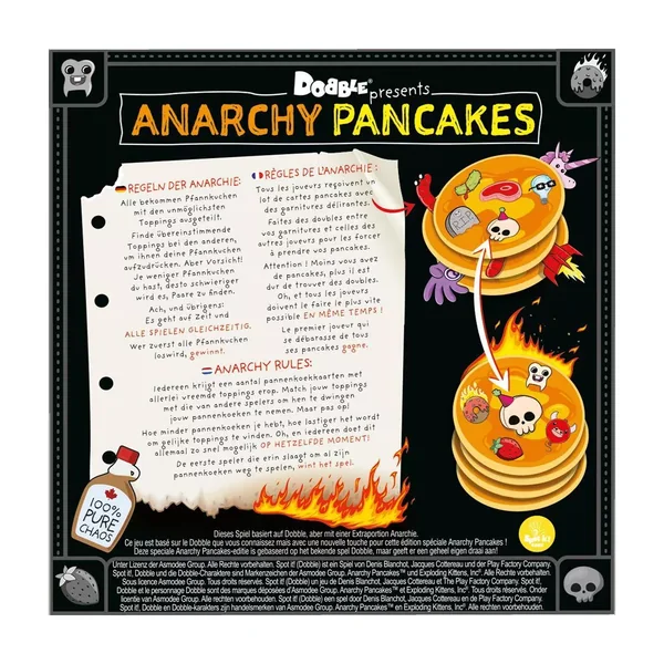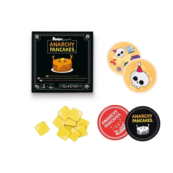 Dobble : Anarchy Pancakes est un d’observation et de reflexes, de 2 à 8 joueurs, dès 8 ans, pour des parties de 15 minutes environ, édité par Asmodee.