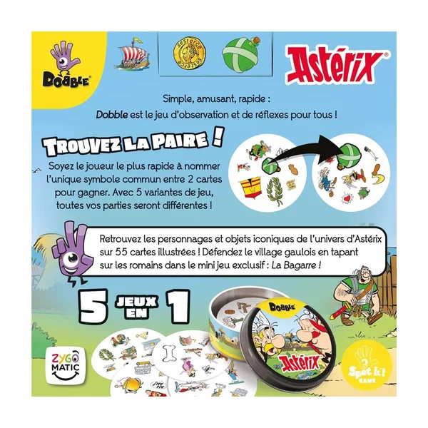 Le but est simple : être le premier à trouver le dessin identique entre deux cartes. Dobble Astérix contient 55 cartes et 1 règle, le tout rangé dans une boîte en métal ronde.