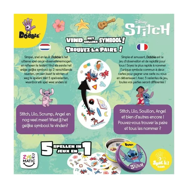 Dobble Lilo et Stitch est un jeu de société d’ambiance jouable de 2 à 8 joueurs, dès 6 ans pour des parties d’environ 15 minutes, édité par Asmodee.