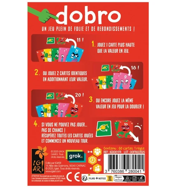 Dobro est un jeu de pli à jouer en famille ou entre amis. Le but est d’avoir le moins de points possible à l’issu des 3 manches. Jouez des cartes pour dépasser la valeur de la carte précédente ou égalisez celle-ci pour doubler la valeur à atteindre. Si un joueur ne peut répondre, il ramasse toutes les cartes du pli !