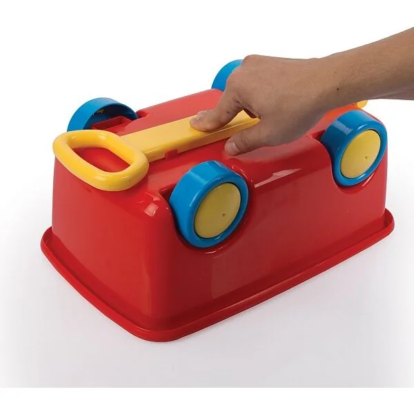 Le chariot en plastique avec de grands blocs est adapté comme boîte de rangement, mais peut également servir au transport de jouets vers le bac à sable.