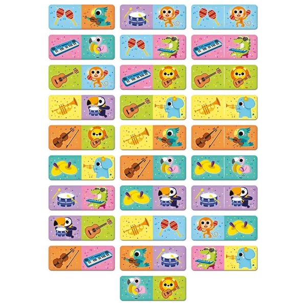 Chaque pièce présente l’illustration d’un instrument de musique et d’un animal en pleine performance. Les enfants sont ainsi initiés aux différents instruments de musique tout en découvrant les animaux de la jungle. Simplement, le but est de relier chaque instrument de musique à son petit musicien, présent sur une autre pièce. Les dominos sont double-faces et présentent aussi les constellations d’un dé, pour jouer à la version plus traditionnelle du jeu.