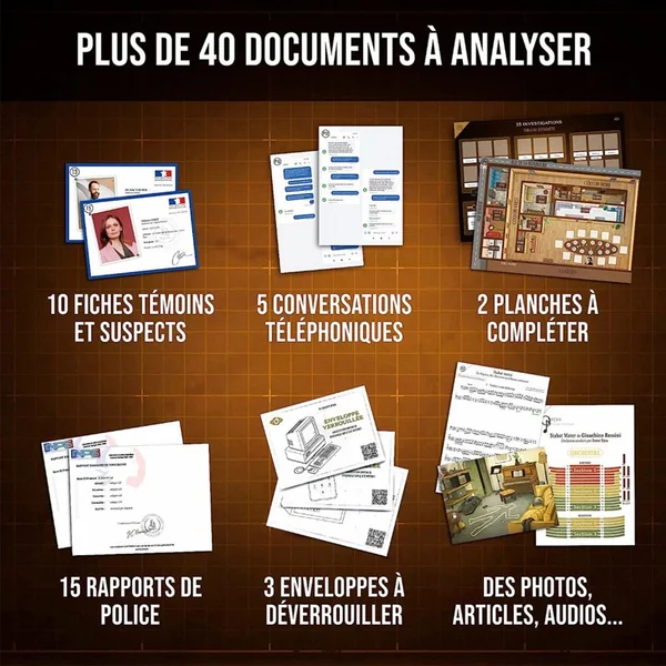 Contient des témoignages, des analyses de la police scientifique, des articles de presse, des photos de la scène de crime, des contenus audio… Information : Attention, présence de petits éléments, risque d’étouffement. Ne convient pas aux enfants de moins de 36 mois. FAQ