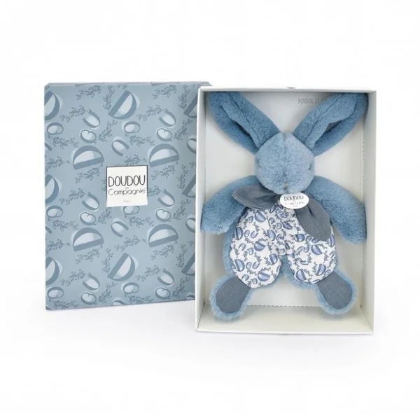 Un petit Doudou LAPIN bleu avec son joli foulard noué autour du cou ! De couleur bleue, il a une forme originale donnée par son tissu froncé, le corps légèrement rembourré, il a de longs bras pour câliner et des petites pattes à manipuler.