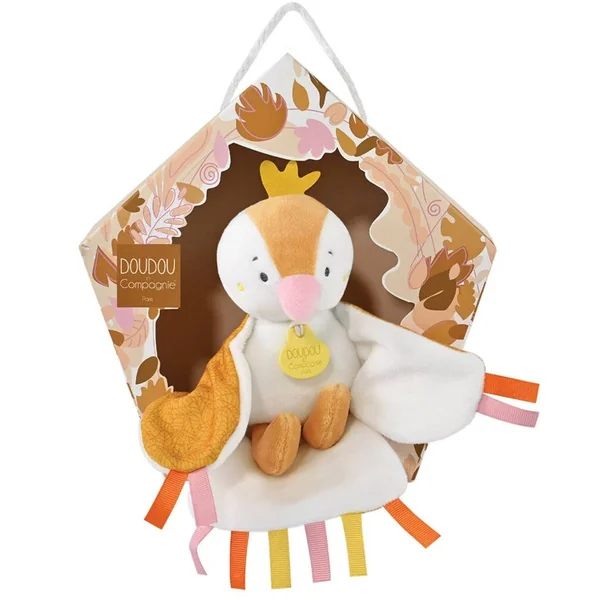 « Secoue-moi pour m’entendre chanter … CUI CUI ! » Voici un chouette Doudou oiseau niché dans une jolie boîte cadeau fleurie très originale en forme de nichoir. En matière très douce majoritairement blanche et ocre clair côté face, côté pile c’est un jersey bouton d’or au motif végétal que l’on découvre. Les extrémités de ses ailes et de sa queue très souples ainsi que le sommet de sa tête sont garnis de petites étiquettes de couleurs, autant de détails à attraper et machouiller pour bébé. Très facile à manipuler et amusant avec son » cui cui » à volonté dès qu’on le secoue, ce Doudou oisillon est un cadeau parfait dès la naissance.