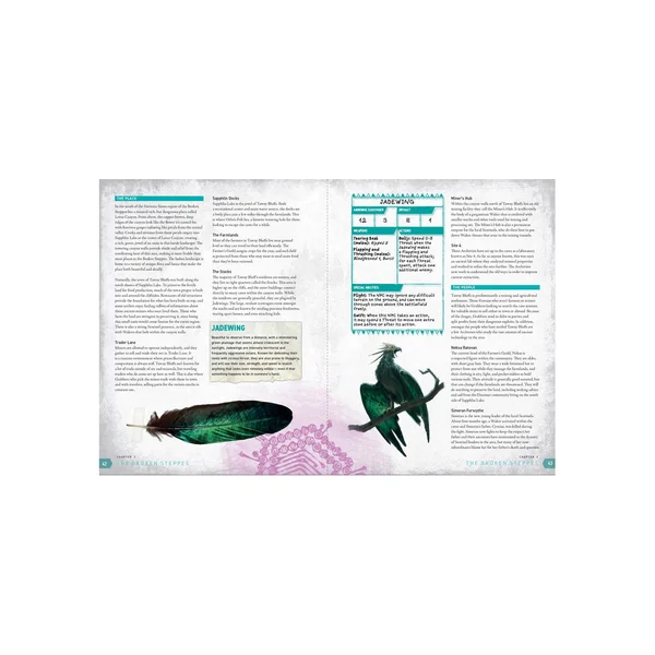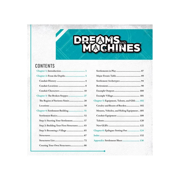 Il y a des siècles, un groupe de chercheurs y a fondé la ville de Trisagasimio pour étudier cette activité. Quels secrets — et quels dangers — s’y cachent encore aujourd’hui ? Tout cela, et bien plus encore, se trouve dans Dreams and Machines: Setting Guide – Broken Steppes, la toute dernière extension pour Dreams and Machines. Riche en nouvelles options de création de personnages et en ressources pour les meneurs de jeu, ce livre est indispensable à quiconque souhaite approfondir ses aventures sur Evera Prime. Dreams and Machines: Setting Guide – Broken Steppes (128 pages, couverture rigide, tout en couleur) comprend :