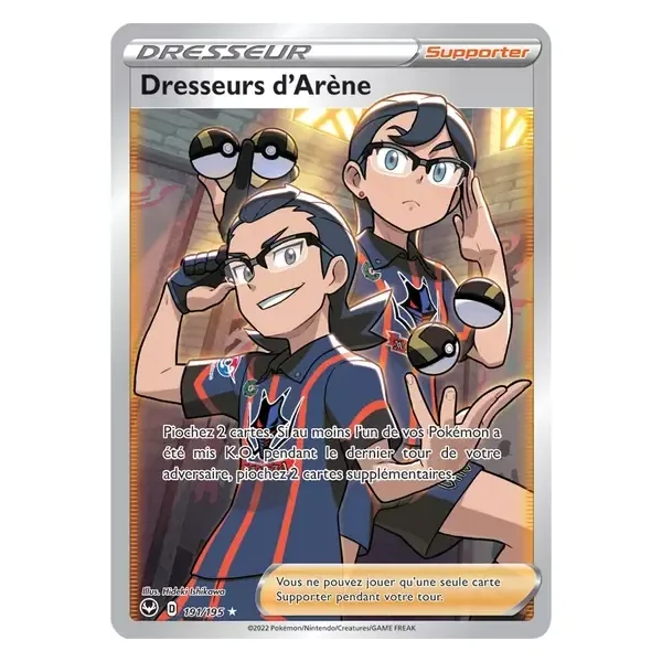 Découvrez Dresseurs d’Arène (sit191), une carte Pokémon de l’extension Tempête Argentée, provenant du bloc Épée & Bouclier. Idéale pour compléter votre collection, cette carte Ultra Rare plaira autant aux collectionneurs qu’aux joueurs.