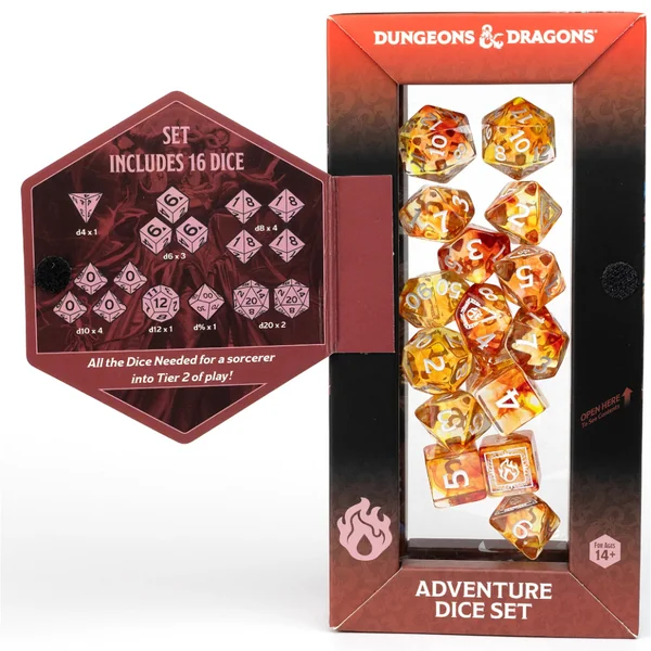 Libérez votre magie innée avec le set de dés d’aventure Dungeons & Dragons pour les Ensorceleurs. Ce set orange flamboyant reflète la puissance brute et indomptée du Sorcier, avec des dés conçus pour lancer des sorts puissants et plier la magie à votre volonté. Que vous libériez un torrent d’énergie arcane ou manipuliez les forces de la nature, ces dés amplifieront les capacités innées de votre Sorcier à chaque lancer.