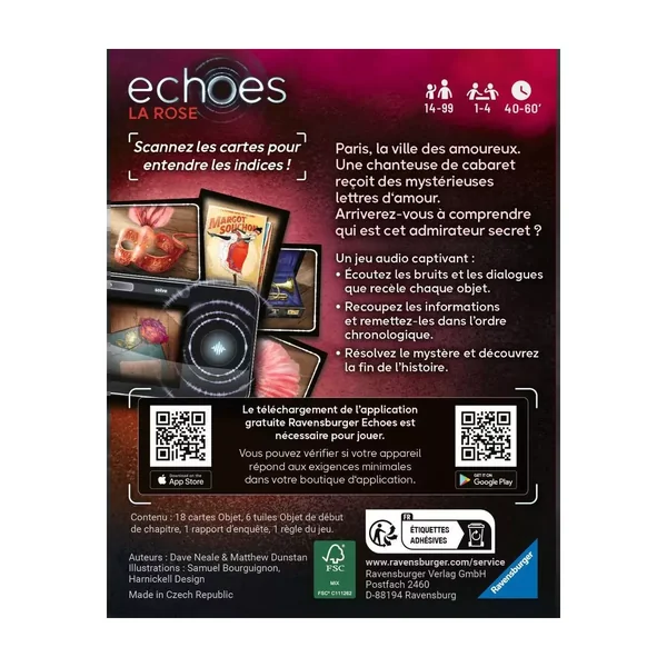 Echoes : La Rose est un jeu d’enquête audio jouable de 1 à 4 joueurs, dès 14 ans pour des parties d’environ 60 minutes, édité par Ravensburger.