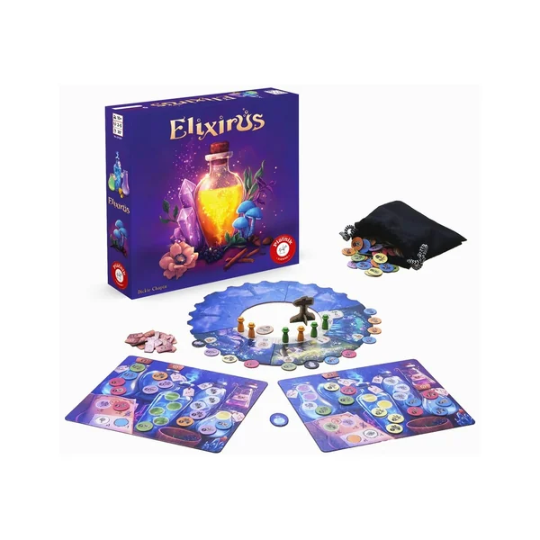 Dans Elixirus, vous rivalisez avec les autres joueurs pour préparer cinq élixirs différents. Le jeu se déroule en manches, chacune comprenant deux phases simples.Pendant la phase de récolte, partez en exploration à travers les lieux mystiques de la forêt pour y trouver les meilleurs ingrédients. Plus leur puissance est élevée, plus vos élixirs auront de la valeur.Durant la phase de mélange, transformez vos ingrédients en élixirs magiques afin de marquer des points.