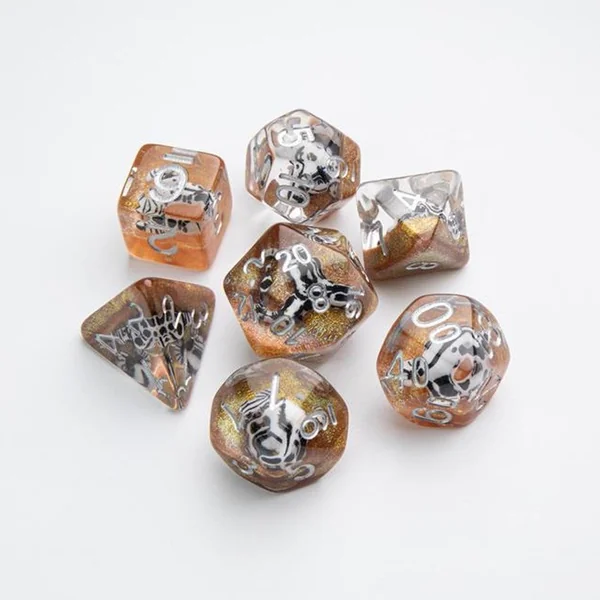 Choisis ton arme! Ce jeu de dés contient un D4, un D6, un D8, deux D10 (10 et 00), un D12 et un D20. Tous les dés sont à coins arrondis et fabriqués à un niveau supérieur. Les Embraced Dice ont un objet intéressant à l’intérieur du cube et feront de votre soirée de jeu un coup critique. Ils sont emballés dans une boîte en carton à fenêtre qui affiche tous les dés à l’avant.