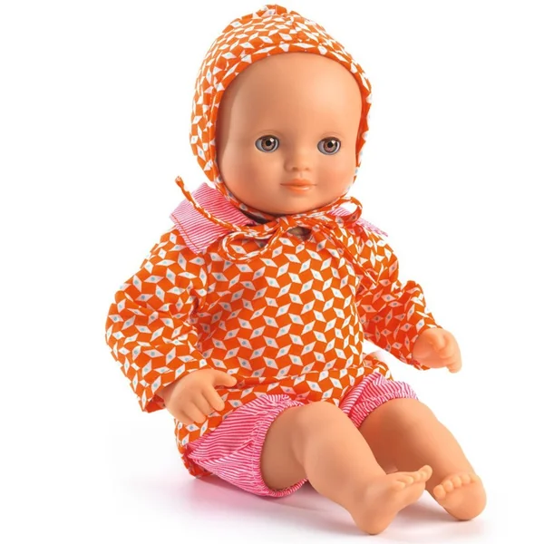 Une tenue estivale et légère en tissu double gaze 100 % coton. Un bloomer à taille élastique et une chemise fleurie qui se ferme avec des scratchs dans le dos permettent aux petits parents d’habiller facilement la poupée. Le béguin complète joliment cette tenue pour protéger bébé du soleil.