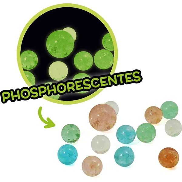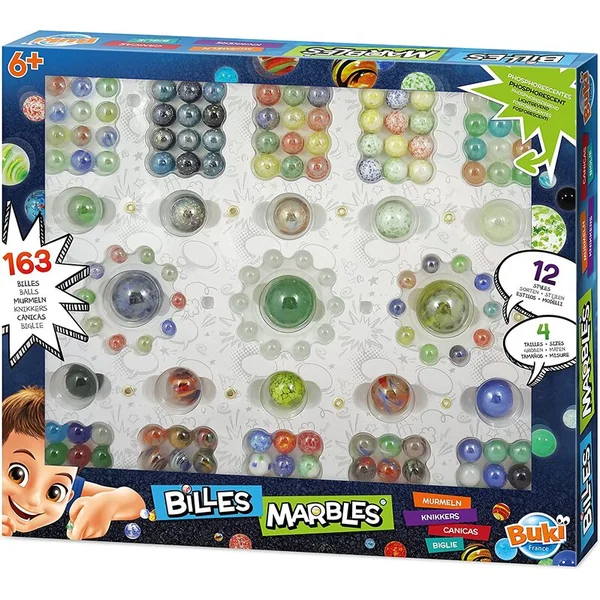 Ensemble de 163 billes en verre de différentes tailles et apparences. L’apparence des billes en verre est ce qui fait la différence entre cet ensemble et les autres billes ordinaires sur le marché. L’ensemble comprend par exemple des iris, des perles nacrées, des marbrées, des à pois, des marbrées, des unies, métalliques et même phosphorescentes dans l’obscurité.