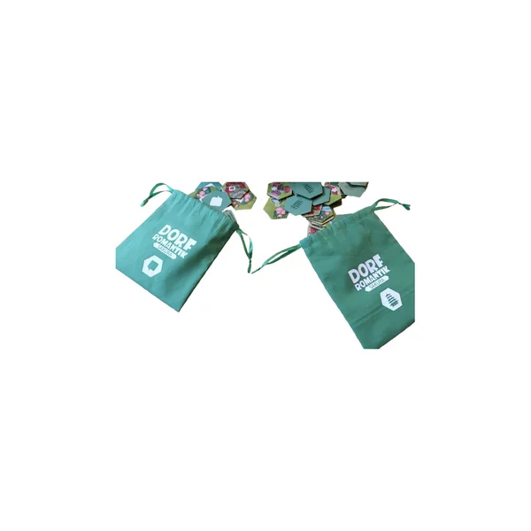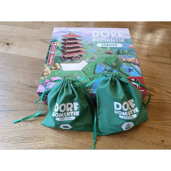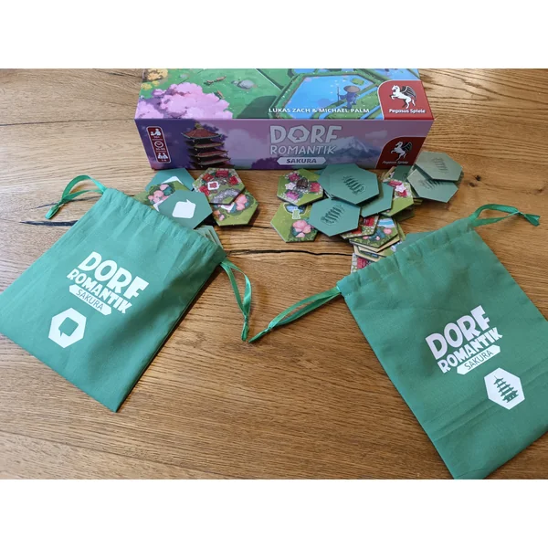 Lot de deux sacs compatibles avec Dorfromantik Sakura, verts, avec logos assortis. Les tuiles de paysage et de mission peuvent désormais être facilement tirées des sacs pendant la partie. Plus besoin de mélanger ni d’empiler les tuiles. Installation rapide et superbe présentation visuelle réunies !