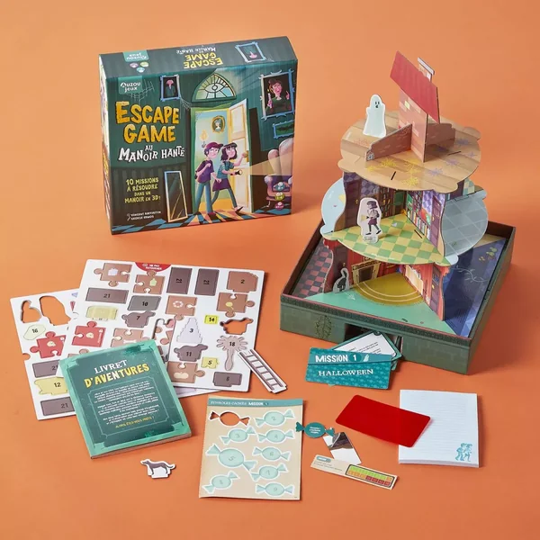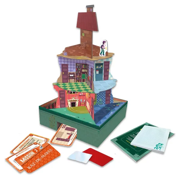 Contenu : 1 manoir en 3D à monter/10 missions/1 filtre rouge/1 miroir/1 bloc-notes/1 livre avec des pièces détachables/ 2 planches d’éléments en carton