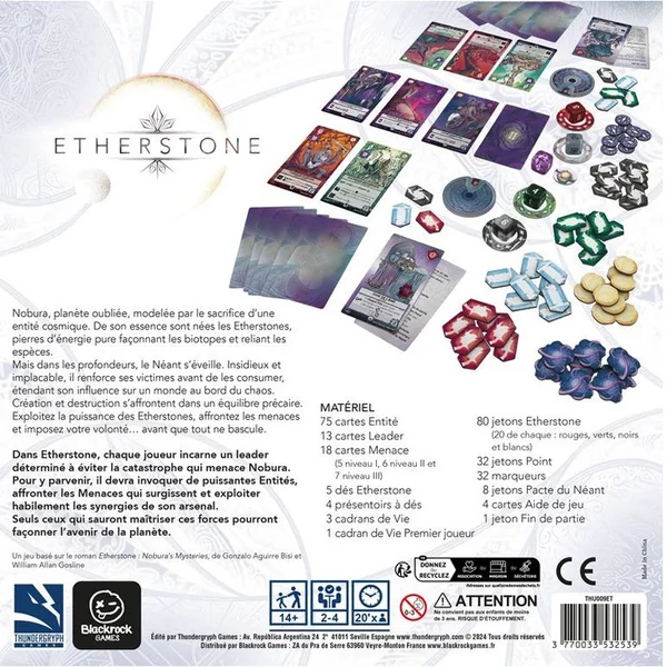 Etherstone est un jeu de combos de cartes et de gestion de ressources dans lequel vous tentez de remporter un maximum de points de victoire. La première étape du jeu consiste à drafter votre main de 7 cartes et votre carte leader. En sélectionnant les dés vous pourrez créer les pierres d’Ether qui sont au cœur du jeu, permettant d’invoquer des cartes de votre main, d’activer des pouvoirs spéciaux et de neutraliser des menaces.