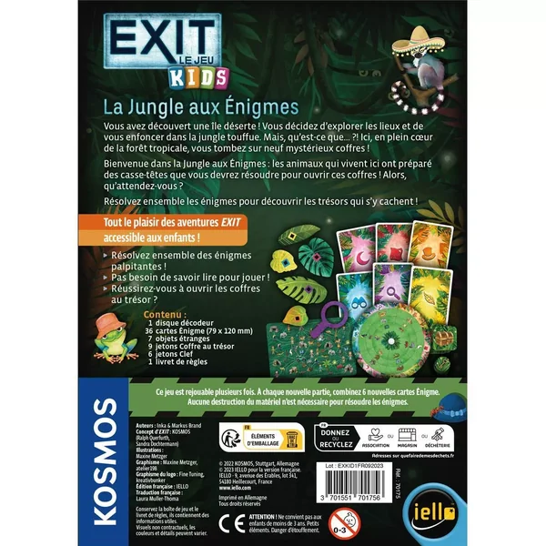 Exit Kids : La Jungle aux Énigmes est un jeu d’énigme pour enfants de la série Exit, édité par Iello pour 1 à 4 joueurs dès 5 ans pour des parties d’environ 20 minutes.