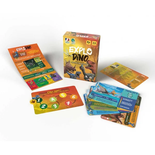 Le jeu est composé de 49 cartes dino à deviner, une carte lexique avec le nom de l’ensemble des créatures présentent dans le jeu, une carte plateau et un pion. Chaque carte dino comporte des informations sur une créature préhistorique :