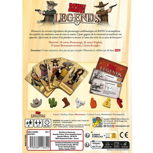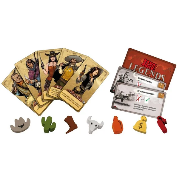 Dans cette extension de Bang!, découvrez les versions légendaires des personnages emblématiques du jeu et accomplissez ses exploits (ou contentez-vous de vous en vanter!) pour gagner de la renommée et améliorer vos capacités. Après tout, la valeur d’un pistolero se mesure à l’aune des récits de ses actes de bravoure.