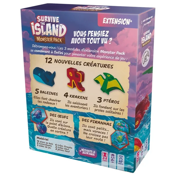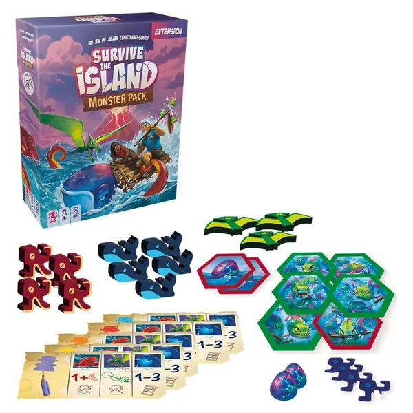 Dans la boîte de base, les joueurs tentaient de s’échapper d’une île en perdition avec le plus de trésors possible… Mais des monstres rôdaient et rendaient la tache difficile. Vous pensiez en être sortis ? C’était sans compter sur l’extension ‘Monster Pack’ ! Désormais des baleines risquent de faire chavirer les radeaux, des krakens saisissent les aventuriers pour les entrainer vers le fond, et des ptérodactyles fondent sur les proies solitaires pour les emporter ! Des œufs sont également disposés dans l’île, quelle créature en sortira ? Quand aux piranhas qui hantent les rivières, autant ne pas croiser leur route.