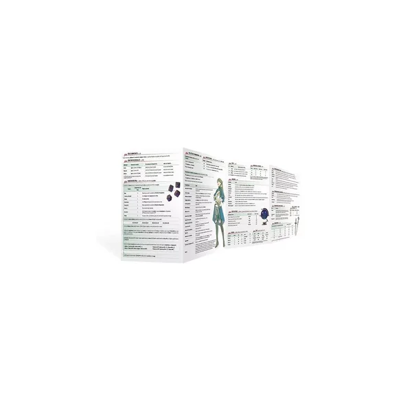 - L’écran du meneur de jeu, composé de quatre panneaux au format A5, est doté dans cette version Remastered d’une magnifique illustration inédite de Takashi Konno. Il regorge de tableaux et de rappels utiles pour faciliter vos parties de Fabula Ultima.