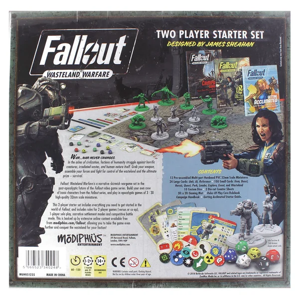 - 100+ petites cartes : Objets (Arme, Équipement, Mod, Chems, Armure assistée), Amélioration, Héroïque, Quête, Avantage, Leader, Exploration, Événement, Désert (Danger, Créature, Étranger)