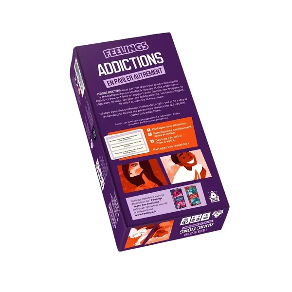 Il reprend la mécanique de jeu de Feelings avec une carte Situation en lien avec les addictions et les conduites addictives – l’alcool, les drogues, le sexe, les jeux, les médicaments, la nourriture et les écrans – lue à haute voix.