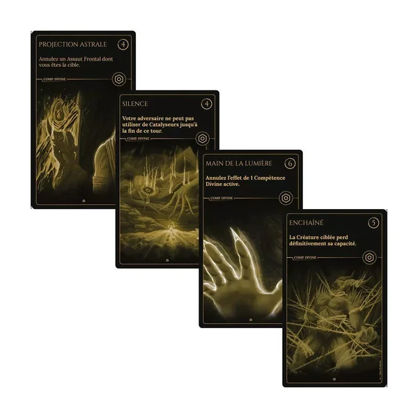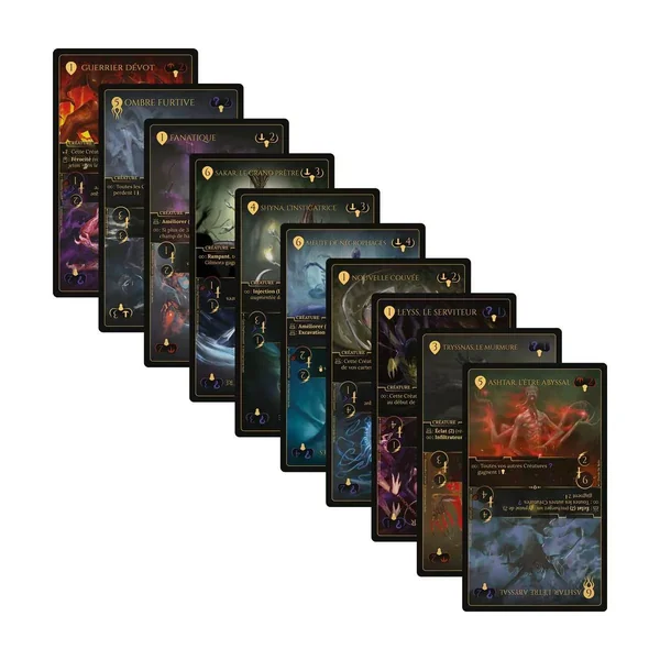 Les cartes créature ont 2 faces, une face « Appel » et une face « Éveil ». Pour les mettre sur le champ de bataille, vous devez attendre leur coût d’attente à tour de rôle. Une fois vos créatures du côté « Appel » vaincues, elles reviendront sous la forme « Éveil ».