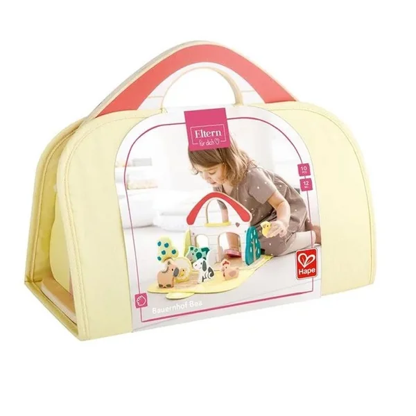 Découvrez la ferme transportable de Hape, un jouet d’éveil en bois et en tissu pour les enfants dès 12 mois.