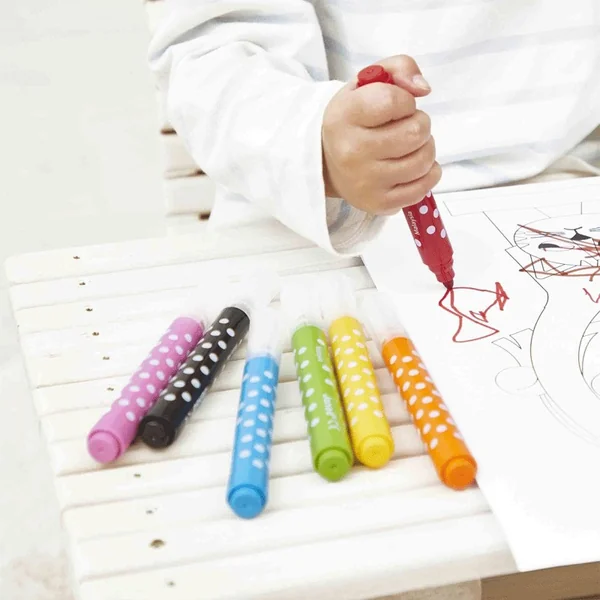 Malin, la pointe est solidement bloquée dans les deux sens et ne peut s’enfoncer ou se retirer. L’encre est facilement lavable. On adore la boite super pratique et réutilisable, pour ranger les feutres après chaque séance de coloriage. En réalisant ses premiers dessins, votre enfant commence à développer sa créativité et travaille sa motricité fine : un super moyen d’aborder le coloriage en prévision de ses prochaines réalisations.