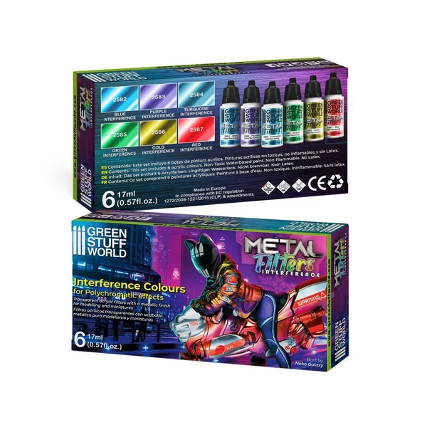 Finition métallique brillante. Valable pour pinceau ou aérographe. Ils donnent de le même résultat que les peintures caméléon, grâce à la combinaison d’une couleur de base et du filtre métallique. Vous pouvez les appliquer à n’importe quelle couleur pour en faire un couleur Caméléon de votre propre conception.