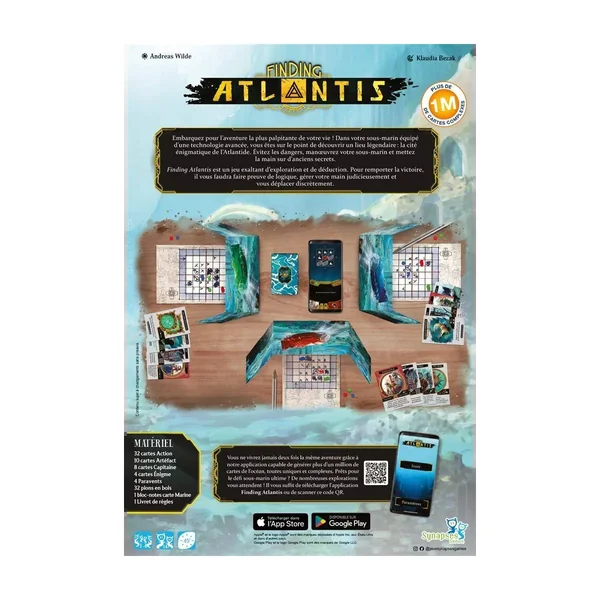 Finding Atlantis est un jeu compétitif de déduction et d’exploration avec des puzzles uniques générés par une application pour 1 à 4 joueurs dès 14 ans, co-édité par Synapses Games et HYBR.