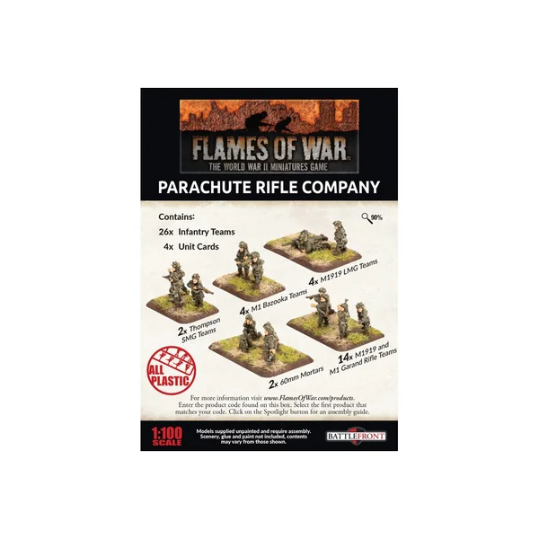 Parachute Rifle Company (Plastic) (UBX64) inclut deux Plastic Thompson SMG Teams, quatre M1 Bazooka Teams, quatre M1919 LMG Teams, deux 60mm Mortar Teams, quatorze M1919 & M1 Garand Rifle Team, et quatre cartes d’unités.