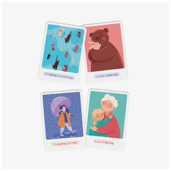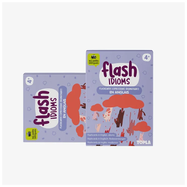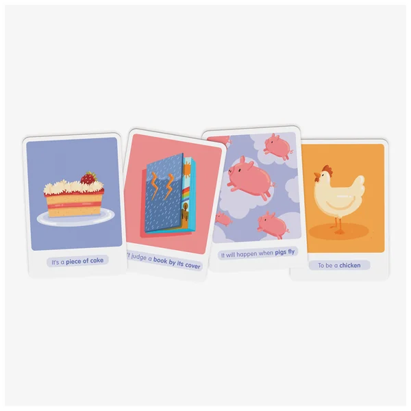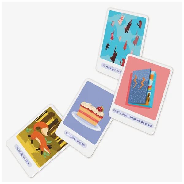 30 cartes illustrées format A6 sur papier tramé pour apprendre l’anglais de façon ludique. Au recto, l’expression idiomatique avec son illustration au sens littéral (fous rires garantis !) et au verso, le vrai sens de l’expression idiomatique et son illustration.