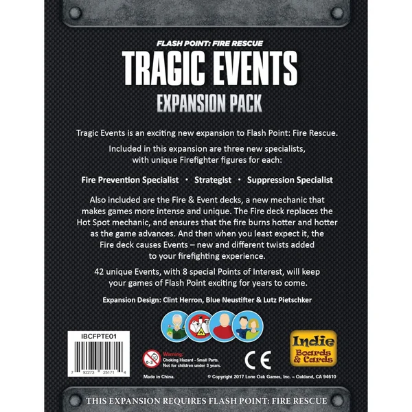 Tragic Events est une extension pour Flash Point: Fire Rescue. Elle introduit les decks Feu et Événements, conçus pour remplacer la mécanique des Points Chauds dans les règles de jeu avancées.