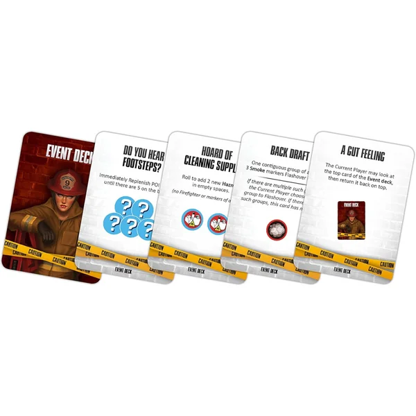 Pendant chaque phase Propagation du Feu, une carte Feu est piochée et résolue. Les cartes Accelerate déclenchent des événements et ajoutent des cartes Flare Up au deck Feu, augmentant ainsi la rapidité de propagation du feu dans la partie. Les cartes Flare Up, quant à elles, déclenchent des événements, ajoutent une autre carte Flare Up au deck et obligent à piocher une carte Feu supplémentaire.