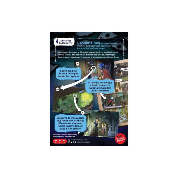Flashback Lucy est le deuxième épisode de la série d’enquête coopératif Flashback, dont la mécanique de jeu originale a été récompensée à l’As d’Or 2023. Flashback Lucy est accessible dès l’âge de 8 ans, de 1 à 4 joueurs, pour des parties de 45 minutes environ, édité par Scorpion Masqué.