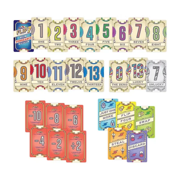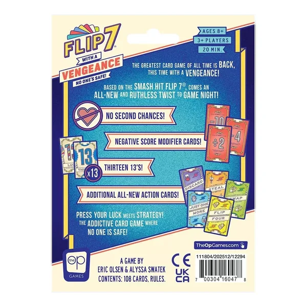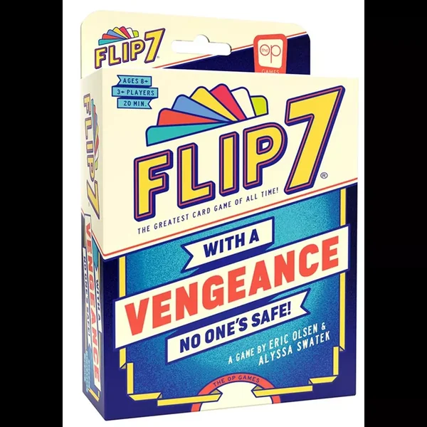 Flip 7 With a Vengeance est un jeu de société familial jouable de 3 à 28 joueurs, dès 8 ans pour des parties d’environ 20 minutes, édité par The OP Games.