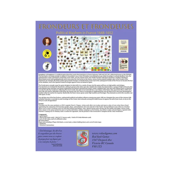 Frondeurs et Frondeuses est un jeu politique axé sur les événements qui se sont déroulés en France entre 1648 et 1652, regroupés sous le nom de la Fronde. Ce résumé est trop court pour tout expliquer, mais en essence, il s’agissait d’une « période de troubles », mêlant grèves des juges et rébellions armées. Paris, centre administratif et plus grande ville du royaume, fut l’épicentre de ces événements, mais des « petites Frondes » eurent également lieu ailleurs, notamment à Bordeaux.