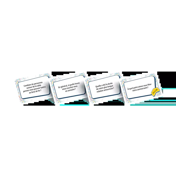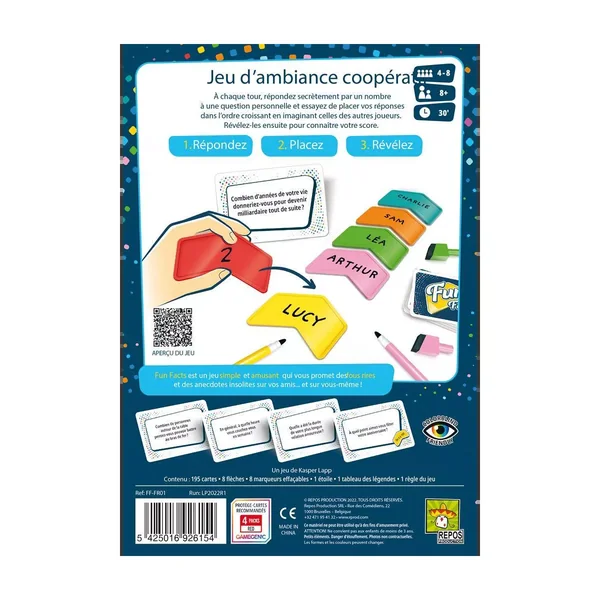 Fun Facts : C’est également le jeu idéal pour apprendre à se connaitre dans une atmosphère bienveillante, en famille comme entre amis. Avec Fun Facts, vous n’êtes jamais à l’abri d’une surprise.