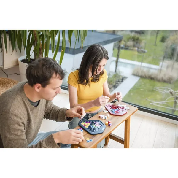 La partie peut maintenant débuter ! Vous devez réaliser, AVANT votre adversaire, les cinq formes de couleur de gemmes imposées en complétant obligatoirement votre plateau à l’aide de vos dix tuiles, même si toutes ne servent pas à la réalisation des formes demandées. L’hexagone plein central ne peut être occupé et aucun espace ne doit être vacant en fin de manche à l’intérieur du plateau.