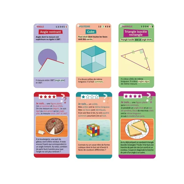 Les joueurs visualisent et identifient les notions géométriques à travers leurs propriétés, des objets familiers, et leur représentation scolaire et une devinette.