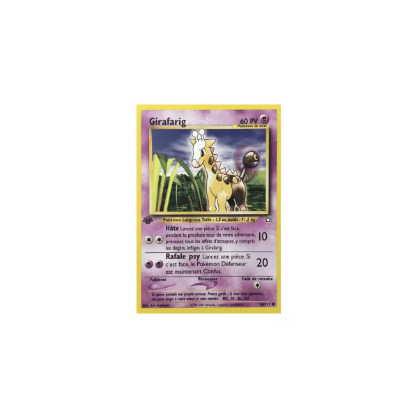 Découvrez Girafarig (ng058), une carte Pokémon de l’extension Neo Genesis, provenant du bloc Wizards. Idéale pour compléter votre collection, cette carte Commune plaira autant aux collectionneurs qu’aux joueurs.