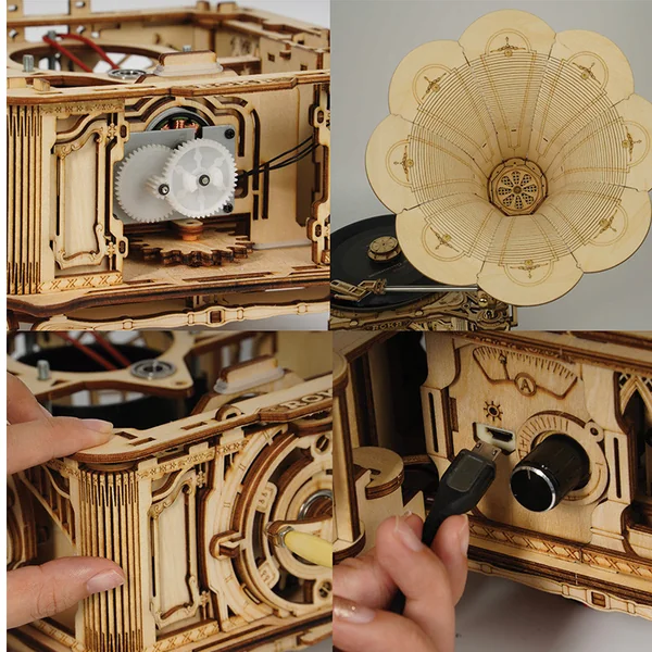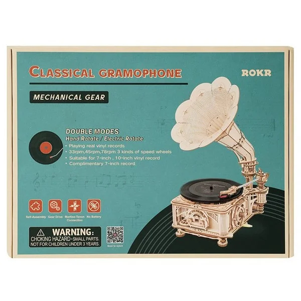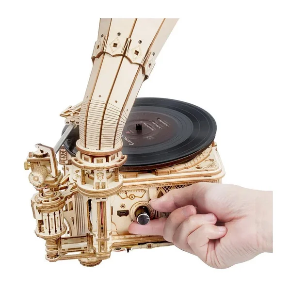 Il s’agit d’un super classique gramophone électrique 3D puzzle en bois, qui est inspiré par l’original inventé par Thomas Edison. De style rétro avec un tourne-disque vintage, ce n’est pas seulement un modèle en bois mais aussi un vrai gramophone qui peut lire des disques.