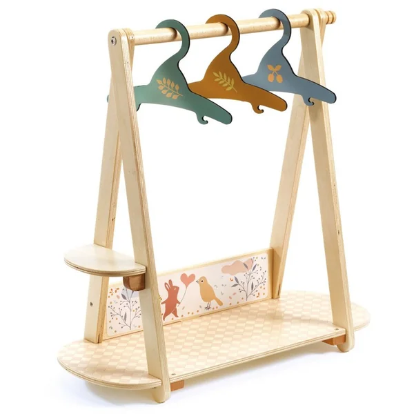 Bien pensé, avec sa barre de penderie et son étagère, ce portant à vêtements en bois permet de ranger toutes les petites affaires de bébé.