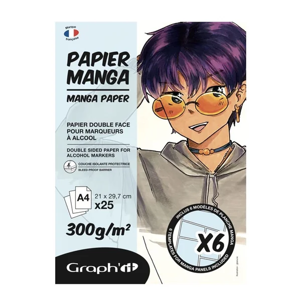 Un bloc manga A4 de 25 feuilles détachables de papier marqueur 300g. Papier unique avec une couche protectrice qui permet de dessiner des deux côtés. Ce bloc inclus également 6 modèles de planche manga à décalquer.