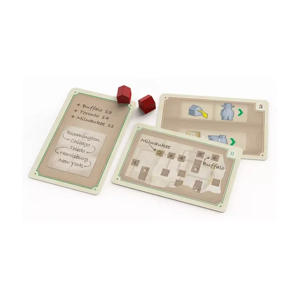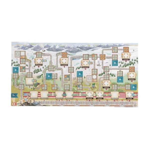– Les plateaux de joueur étant à double couche, une extension de plateau de jeu qui présente différentes voies ferrées et les tuiles de ville moyenne sont modifiées.