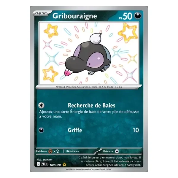 Découvrez Gribouraigne (paf189), une carte Pokémon de l’extension Destinées de Paldea, provenant du bloc Écarlate & Violet. Idéale pour compléter votre collection, cette carte Shiny Rare plaira autant aux collectionneurs qu’aux joueurs.
