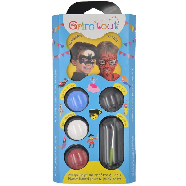 GRIM’TOUT est un maquillage de théâtre à l’eau de qualité spécialement conçu pour convenir aux peaux délicates des enfants. Toujours dilué à l’eau, il s’applique simplement à l’aide d’une éponge ou d’un pinceau !