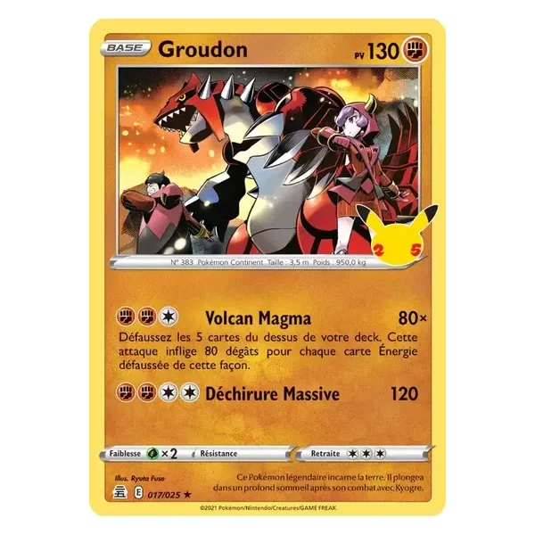 Découvrez Groudon (cel017), une carte Pokémon de l’extension Célébrations, provenant du bloc Épée & Bouclier. Idéale pour compléter votre collection, cette carte Holo Rare plaira autant aux collectionneurs qu’aux joueurs.